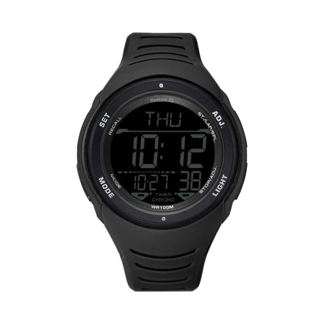 Tämä reebok vertex-kello on 45 mm. Abs-kotelo ja muovinen hihna. Kellossa on aikaa, hälytystä, ajanottoa, ajastinta, päivää ja päivämäärää ja se on vedenpitävä jopa 100 metriin asti.