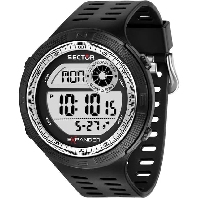 Sectorin digitaalinen kello on varustettu 50 mm: llä. Muovikotelo ja muovilasi. Kello tulee alkuperäiseen sector-pakkaukseen ja 2 vuoden takuun.