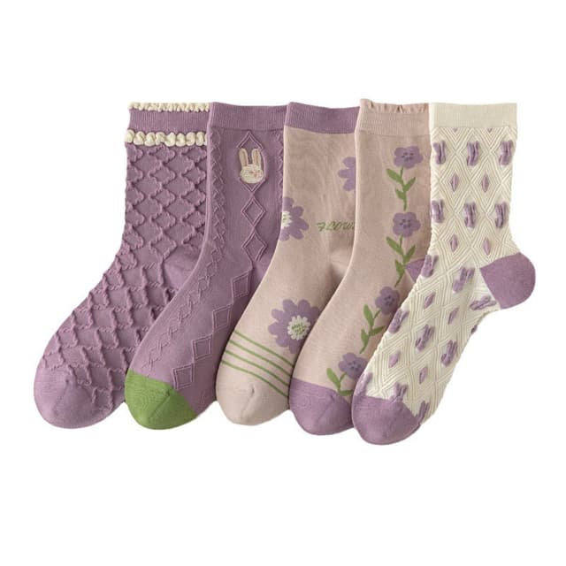 Tämä setti sisältää yhden parin kirjailtuja pupuja, kukkia, röyhelöitä, ruudullisia kuvioita ja tyylikkään yksivärisen violetin parin. Jokainen malli on ainutlaatuinen, ja se lisää asuusi eleganssia ja persoonallisuutta.Tutustu ominaisuuksiin