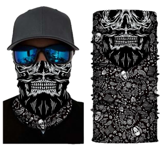 Tyylikäs musta kommandopipo, jossa valkoiset kuviot ja kallo. Valmistettu pehmeästä ja mukavasta materiaalista ja sitä voidaan käyttää monella eri tavalla. Sopii kypärähupuksi, suksinaamariksi, moottoripyöränaamariksi, kaulanlämmittimeksi, huiviksi, kasvosuojaksi ja muuksi. Suojaa auringolta, pölyltä ja tuulelta.