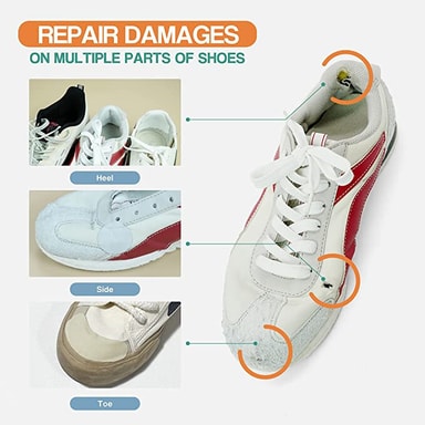 Useita käyttötarkoituksia: Näitä tarroja voidaan käyttää myös muiden kengän vaurioiden ja reikien korjaamiseen tai kantapään suojana hankautumisen estämiseksi.
