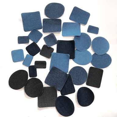 Kestävästä denimkankaasta valmistetut korjauspaikat eri väreissä ja muodoissa. Revenneelle alueelle silitettävät paikat ovat tyylikäs, joustava ja yksinkertainen ratkaisu, jossa ei tarvitse ompelua. Kangaslappu voidaan leikata haluttuun muotoon.