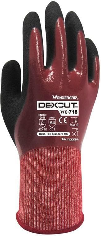 WG-718 Dexcut® on kolminkertainen nitriilipinnoitettu käsine, jossa on 13 gaugen sisävuori, joka on valmistettu spandexista, Tsunooga ™ -suorituskykyisestä polyeteenistä ja mineraalikuiduista. Tsunooga ™ -suorituskykyinen polyeteenikuitu tarjoaa erinomaisen viillonkestävyyden (ISO 13997, luokka D) ja erittäin hyvän joustavuuden pitäen ihon raikkaana. WG-718 on 100% läpäisemätön teollisuusöljyille ja -nesteille, joten se on ihanteellinen suoja intensiiviseen käyttöön erittäin öljyisissä tai erittäin kosteissa ympäristöissä.