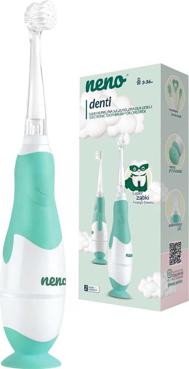 Lapsille suunniteltu Neno Denti -sähköhammasharja pitää hyvää ja hellää huolta lapsesi hampaista ja ikenistä. Se sisältää kolme harjapäätä, mukaan lukien ienhierontapään, integroidun LED-valon sekä hauskan muotoilun imukupilla.Tutustu ominaisuuksiin
