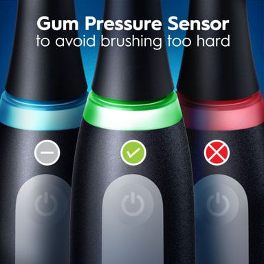 Älykäs painesensori: iO3-sähköhammasharjan älykäs painesensori loistaa punaisena, valkoisena tai vihreänä sen mukaan tarvitseeko sinun vähentää tai lisätä painetta vai teetkö kaiken juuri oikein.