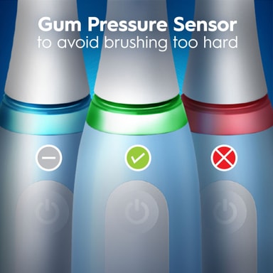Älykäs painesensori: iO3-sähköhammasharjan älykäs painesensori loistaa punaisena, valkoisena tai vihreänä sen mukaan tarvitseeko sinun vähentää tai lisätä painetta vai teetkö kaiken juuri oikein.