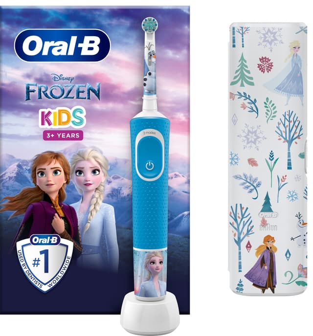 Oral-B Vitality Kids Frozen -sähköhammasharja on suunniteltu erityisesti olemaan hellä lasten hampaille ja ikenille. Pyöreä harjaspää on täydellisen kokoinen pienille suille ja sen huippupehmeät harjakset poistavat plakin hampaista ja ikenistä tehokkaasti. Sähköhammasharja on yhteensopiva Disney Magic Timer -sovelluksen kanssa, sisältää kätevän matkakotelon ja neljä Disney Frozen -tarraa, joiden avulla lapsi voi koristella laitteen kahvan mielensä mukaan.