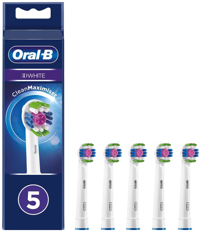 Oral-B 3D White -harjaspäiden ansiosta sinulla on aina käsillä keino keskeytyksettömään harjaukseen. Tämä pakkaus sisältää viisi vaihtoharjaspäätä, joissa on kiillotuskuppi, joka kykenee poistamaan pinnalliset värjäytymät valkoisempien hampaiden aikaansaamiseksi ensimmäisestä käyttöpäivästä lähtien. Näiden harjaspäiden avulla poistat jopa 100 % enemmän bakteeriplakkia kuin tavallisella käsikäyttöisellä harjalla. Niiden harjakset vaihtuvat kätevästi vihreästä keltaiseksi osoittaakseen vaihtotarpeen CleanMaximiser-teknologian ansiosta. Ne sopivat kaikkiin Oral-B-sähköhammasharjoihin iO- ja Pulsonic-malleja lukuun ottamatta.