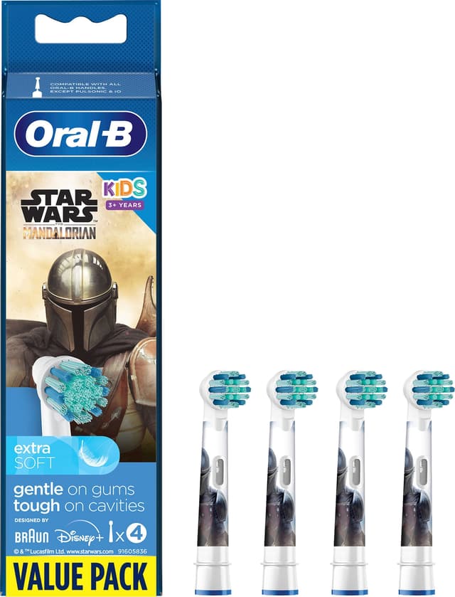 Oral B Kids Mandalorian -vaihtoharjoissa on Mandalorian-aiheinen kuvitus, erikoispehmeät harjakset ja pienet, pyöreät päät hellävaraiseen ja tehokkaaseen hampaiden hoitoon. Pakkaukseen sisältyy neljä vaihtoharjaa.