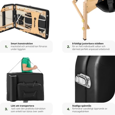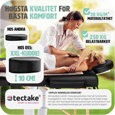 Tectaken ylellinen ja erittäin vakaa hierontapöytä on suunniteltu elinikäiseen käyttöön. Hierontapöydässä on erittäin käytännöllinen taittojärjestelmä ja se on käyttövalmis vain muutamassa sekunnissa! Tämä älykkäästi suunniteltu hierontapöytä tarjoaa ylittämätöntä vakautta, turvallisuutta ja korkealaatuista makuumukavuutta (pehmustekorkeus 13 cm, puhdas verhoilu n. 10 cm) ja on myös kannettava käytännöllisen kantolaukun ansiosta (sisältyy hintaan)! Sohva on kokoontaitettava, säädettävä ja kevyt säilytyksen ja kuljetuksen helpottamiseksi, mutta ei tingi vakaudesta tai turvallisuudesta. Laadukkaasta hienosoluisesta vaahtomuovista (Oxford 600D- erittäin vahva) valmistettu mukava pehmuste mukautuu täydellisesti vartalon muotoon, jolloin paino jakautuu tasaisesti ja painepisteet vältetään. Pehmeä vinyylipäällyste on naarmuuntumaton ja iskunkestävä sekä vettä ja öljyä hylkivä. Kaiken kaikkiaan pöydän laatu tekee siitä erinomaisen yhdistämällä mukavuuden ja käytännöllisyyden. Varmista ammattimainen ulkonäkö tällä tectaken 3-alueisella hierontapöydällä.