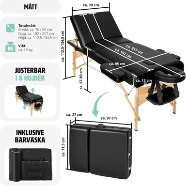 Tekniset tiedot • Pehmuste: n. 10 cm • Pituus 191 cm ilman pääntukea, pääntuen kanssa n. 218 cm • Sohvan leveys ilman käsinojia 70 cm - käsinojien kanssa jopa 102 cm • Työskentelykorkeus 65 - 90 cm - säädettävissä 3 cm:n askelin • Sohvan paino 19 kg • Kuormitettavissa 250 kg:iin asti • Sohvan mitat kokoontaitettuna (L/B/H): 96 x 29 x 70 cm • Materiaali: tekonahka . Toimitus • hierontapöytä • ergonominen monitoiminen pääntuki • poistettava käsinojatuki • kantolaukku • kaksi käsinojaa
