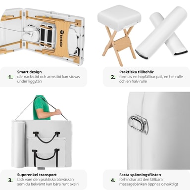 Tässä Tectaken hierontapöydässä on erittäin käytännöllinen kokoontaitettava järjestelmä, ja se on käyttövalmis vain muutamassa sekunnissa! Pöytä on erittäin mukava ja kestävä ja valmis elinikäiseen käyttöön.Tutustu ominaisuuksiin