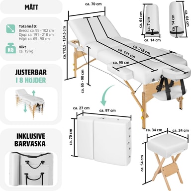 Tässä Tectaken hierontapöydässä on erittäin käytännöllinen kokoontaitettava järjestelmä, ja se on käyttövalmis vain muutamassa sekunnissa! Pöytä on erittäin mukava ja kestävä ja valmis elinikäiseen käyttöön. Tämä älykkäästi suunniteltu hierontapöytä tarjoaa ylittämätöntä vakautta, turvallisuutta ja korkealaatuista makuumukavuutta (pehmusteiden korkeus 13 cm, puhdas verhoilu n. 10 cm) ja on myös kannettava käytännöllisen kantolaukun ansiosta (sisältyy hintaan)! Laadukkaasta hienosoluisesta vaahtomuovista (Oxford 600D erittäin vahva) valmistettu mukava sohvan pehmuste mukautuu täydellisesti kehon muotoon, jolloin paino jakautuu tasaisesti ja painepisteet vältetään. Pehmeä vinyylipäällyste on naarmu- ja iskunkestävä sekä vettä ja öljyä hylkivä. Pöytä on korkeussäädettävä optimaalisia hieronta-asentoja varten. Hierontapöydät ovat tärkeä osa terapiavälineitä, ja tätä pöytää täydentää lisävarustesarja, johon kuuluu muun muassa hierontajakkara, pääntuki, polvituki ja käsinojatuki. Tämä tectaken kevyt, kokoontaitettava hierontapöytä olisi täydellinen työkaveri vuosiksi eteenpäin.