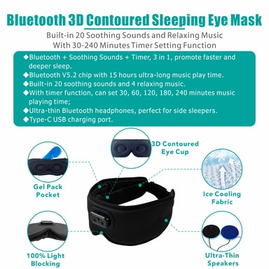 1. Flera uppspelningslägen: Sömnmasken har två uppspelningslägen: Bluetooth och vitt brus. Användare kan välja olika lägen efter sina egna behov. Den har också en tidsfunktion, vilket gör den mer bekväm för användarna att använda.