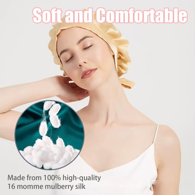 Tämä 100 % korkealaatuisesta 16 momme silkistä valmistettu unimyssy on uskomattoman pehmeä ja sileä ihoa vasten, minimoiden kitkaa ja ehkäisten hiusten katkeilua, kaksihaaraisia ja pörröisyyttä.Tutustu ominaisuuksiin