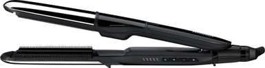 Jotta hiuksesi pysyisivät silkkisen pehmeinä, suoristusrauta on varustettu leveillä timanttipinnoitteisilla keraamisilla levyillä sekä irrotettavilla kammoilla.