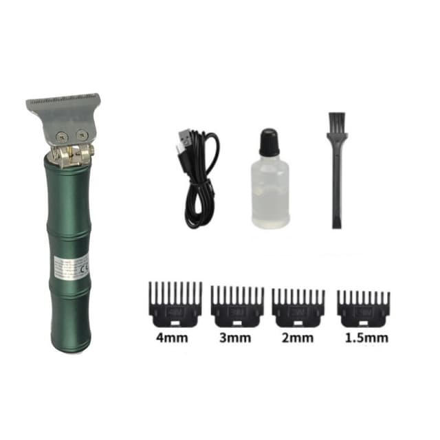 Denna elektriska hårklippare är gjord av högkvalitativ aluminiumlegering zinklegering, graverad med utsökt grönt bambumönster. USB-laddning, lämplig för gravering, push white, gradient, trimning av hårstil.