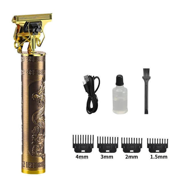 Denna elektriska hårklippare är gjord av högkvalitativ aluminiumlegering zinklegering, graverad med utsökt långa drake- och fenixmönster. USB-laddning, lämplig för gravering, push white, gradient, trimning av hårstil.