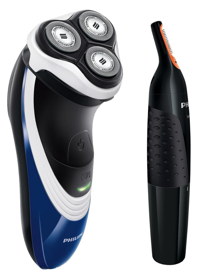 Pakkaus sisältää Philips PowerTouch parranajokoneen ja nenä- ja korvakarvatrimmerin.Tutustu ominaisuuksiin
