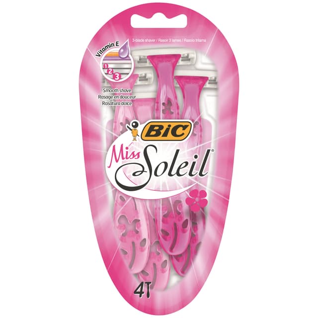 Bic Miss Soleil -höylät tarjoavat sileät karvanajotulokset. Pakkaukseen sisältyy neljä 3-teräistä höylää, joissa on voidenauha. Kaareva ergonominen kahva tarjoaa paremman otteen ja käytettävyyden.