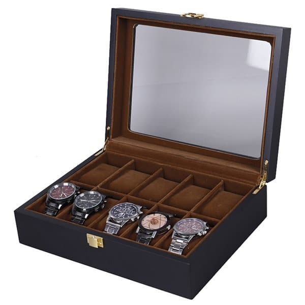 Puinen kotelo, jossa esittelyikkuna ja 10 lokeroa kelloille
