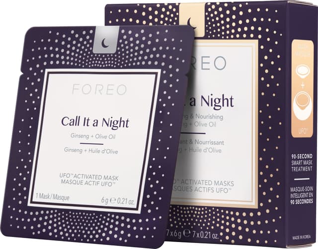 Oliiviöljyä ja ginsengjuurta sisältävä Foreo Ufo Call It a Night F3821 -kasvonaamio ravitsee kaikkia ihotyyppejä päivän päätteeksi. Toimii yhdessä Foreo Ufon ja Foreo Ufo minin kanssa. Pakkaus sisältää 7 Foreo-kasvonaamiota.