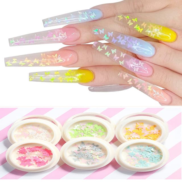 Hienot kynsikoristeet korkealaatuisesta materiaalista, myrkyttömät ja ympäristöystävälliset. Perhospaljetit ovat kestäviä ja lämmönkestäviä, ja ne toimitetaan 6 pienessä laatikossa eri väreillä.