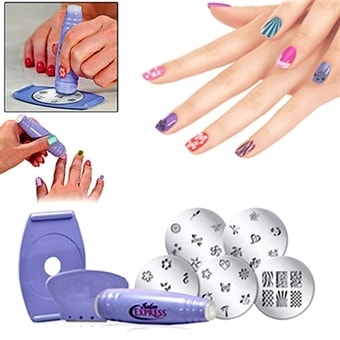 Kynsikone / leimasin kynsille. Tee helposti haluamasi kuvioita kynsiisi - kukkia, eläimiä ja muita kuvioita. Todella helppokäyttöinen. Sopii kaikkien kynsilakkojen kanssa. Et tarvitse lainkaan sähkövirtaa. 34 kpl eri motiiveja. Koko: 95x28x28mm