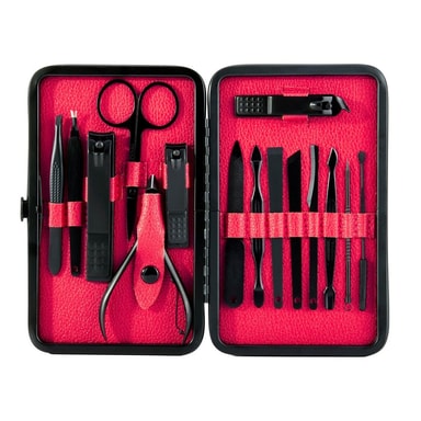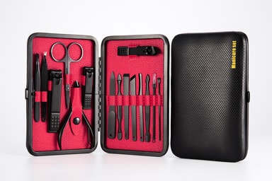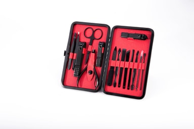 15 manikyyrityökalua (Isot kynsisakset, pienemmät kynsisakset, kulmakynsisakset, kynsinaksit, suora kynsiveitsi, kulmakynsisakset, neula aknen poistoon, kynsinaavin, kaavin kahdella eri päässä, kaavin kynsinauhojen kuorimiseen, korvakaavin ja kulmakarva pinsetit)