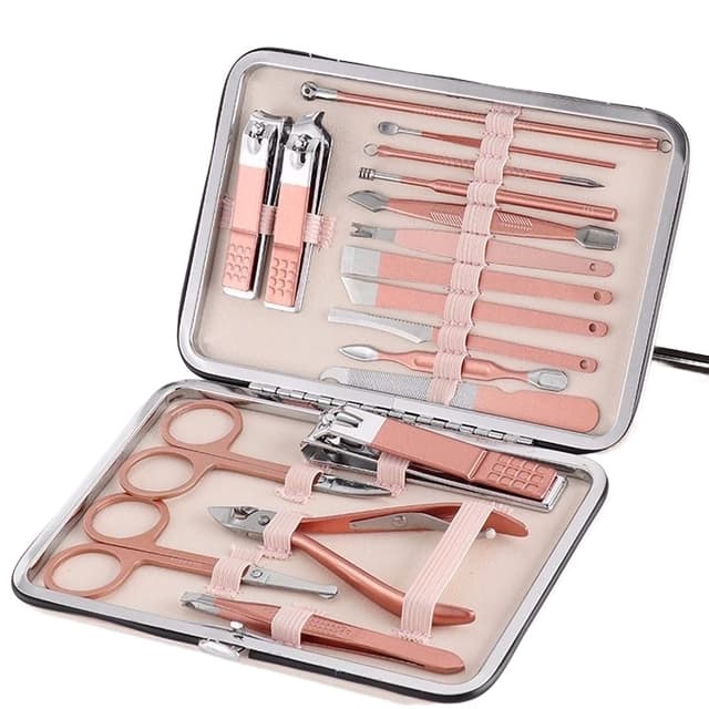 Denna verktygssats har 18 verktyg som har en mängd olika funktioner inklusive handvård, fotvård och ansiktsbehandling. Allt tillverkat i rostfritt stålmaterial, skarpt och hållbart. Kom med ett PU-fodral, håll ordning på alla verktyg.