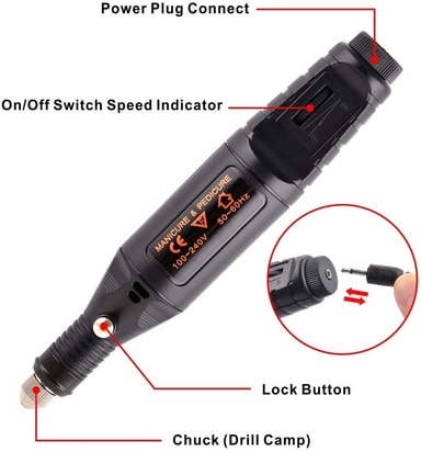 Mukana tulevat tarvikkeet: Sileä pieni sähköinen kynsiviila, joka sisältää 6 terää ja 6 hiomaterää. Sopii erityisen hyvin akryylikynsitaideille, mutta myös muihin manikyyriin ja pedikyyreihin.