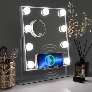 Bluetooth-kaiutin & langaton lataus Voit yhdistää puhelimesi meikkispeiliin Bluetoothin kautta ja kuunnella musiikkia meikattaessa. Spegeliin kuuluu myös langaton laturi puhelimesi lataamista varten.