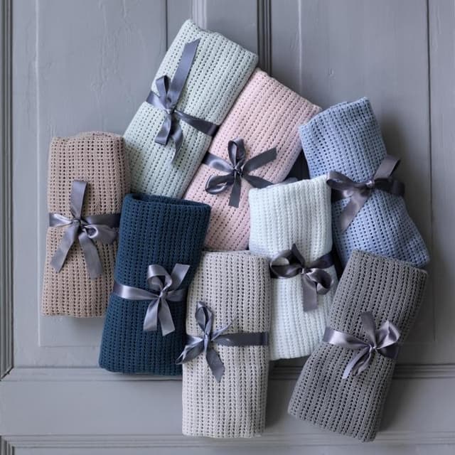 Perfekt present, till exempel vid en babyshower, då filten levereras med rosett av vitt bomullsband.