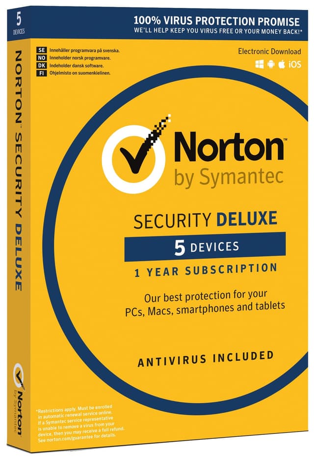 Norton Security Deluxe tarjoaa tehokkaan ja monipuolisen tietosuojan viidelle (5) laitteelle. Surffaile verkossa huoletta ja suojaa Windows ja/tai Mac -tietokone tai tablet -laite.