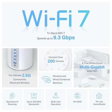 Uusimmilla Wi-Fi 7 -ominaisuuksilla, kuten 320 MHz kanavat, 4K-QAM ja 6 GHz taajuusalue, varustettu tämä järjestelmä takaa poikkeuksellisen suorituskyvyn ja luotettavuuden verkossa.