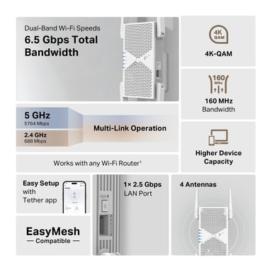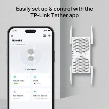 TP-Link RE405BE WF7/BE6500 -wifi-verkon laajennin tarjoaa 6,5 Gbps kaksikaistaisen Wi-Fi 7 -yhteyden, 2,5 G Ethernet-portin, EasyMesh-tuen ja helpon asennuksen WPS- tai Tether-sovelluksen kautta saumattoman yhteyden takaamiseksi.Tutustu ominaisuuksiin