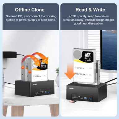 Maiwo USB3.1 Docking Station yhdistää nopean kovalevyn kloonauksen monipuoliseen liitettävyysratkaisuun. Se tukee sekä 2,5"" että 3,5"" SATA HDD/SSD-levyjä ja voidaan käyttää offline-kloonauksena tai ulkoisena dokkiasemana. Integroitu liitettävyys, kuten HDMI, USB, LAN ja kortinlukija, tekevät tästä täydellisen ratkaisun tiedonhallintaan ja työasemille.Tekniset tiedot: