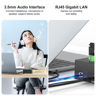 Kaapissa on tietokoneen USB-C-liitännän lisäksi USB-A 3.1 ja USB-C 3.1 näppäimistön, puhelimen, USB-muistin jne. liittämistä varten, ja molemmat USB-portit tukevat tiedonsiirtonopeuksia jopa 10 Gbps ja on taaksepäin yhteensopiva aiempien USB-versioiden kanssa. Tallennustilan lisäksi voit liittää tietokoneeseesi myös ulkoisen näytön HDMI 2.0 -portin kautta, joka tukee jopa 4K60Hz resoluutioita. Telakointiasemassa on myös portti 3,5 mm AUX- ja RJ45 Ethernet -portille, joka tukee 1 Gbps verkkoyhteyttä. Kaappi saa virtansa mukana toimitetusta 36 W:n virtalähteestä, joka tukee ylivirta-, ylijännite- ja oikosulkusuojausta. Ei vaadi ohjaimia, plug & play.