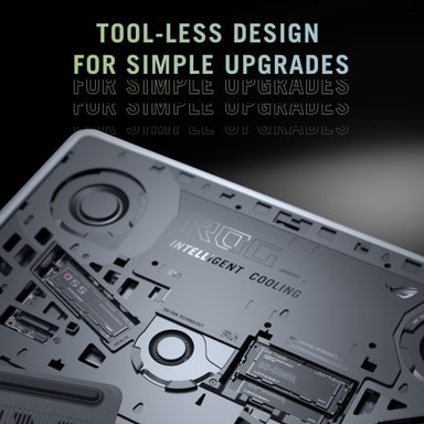 Vuoden 2025 Strix G18 on muotoiltu kokonaan uudelleen, mikä tekee päivityksistä ennenkokemattoman helppoja. RAM-muisti, SSD-asemat ja tuulettimet ovat helposti ulottuvilla ilman työkaluja, ja uusin Q-latch-järjestelmä mahdollistaa entistä vaivattomamman SSD-paikkojen käsittelyn. Ammattitaitoisen varikkomiehistön tavoin voit vaihtaa SSD-asemat ja RAM-muistit sekunneissa ilman rytminvaihdosta. Erikoissuunniteltu kehys peittää loput emolevystä muiden komponenttien suojaamiseksi. Kehyksen voi irrottaa helposti muutamalla ruuvilla, jos haluat tutkia laitetta tarkemmin.