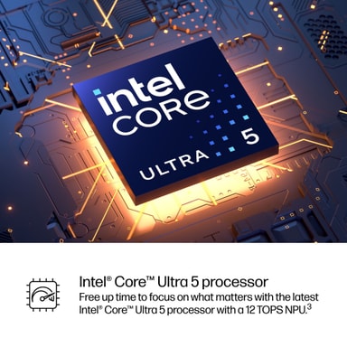 • Intel Core™ Ultra 5 225U (jopa 4,8 GHz Intel Turbo Boost -tekniikalla, 12 Mt:n L3-välimuisti, 12 ydintä, 14 säiettä)