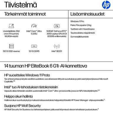 AI-pohjaiset käyttökokemukset ja moderni liitettävyys parantavat käyttäjien tuottavuutta. Konfiguroitava 14 tuuman HP EliteBook 6 G1i -AI-kannettava tarjoaa 11 TOPS:n NPU:n[3], yritystason tietoturvan ja hallittavuuden ja täyttää yrityskäyttäjien vaativat tarpeet.