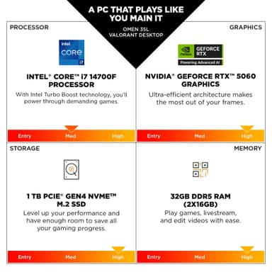 HP OMEN 35L GT16-0115no -pelitietokone tarjoaa huipputehoa Intel® Core™ i7-14700F -prosessorilla, GeForce RTX 5060 -näytönohjaimella, 32 GB DDR5-muistilla ja 1 TB SSD-muistilla tyylikkäässä, työkaluttomassa kotelossa helppoon päivitykseen.Tutustu ominaisuuksiin