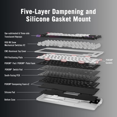ASUS ROG Azoth X sisältää vaihdettavat ROG NX V2 -mekaaniset kytkimet, jotka tarjoavat hienostuneen ja pehmeämmän kirjoitustuntuman. Ne on optimoitu äänen ja erilaisten näppäinhattuprofiilien yhteensopivuuden suhteen, mikä tekee kokoonpanon mukauttamisesta helppoa.