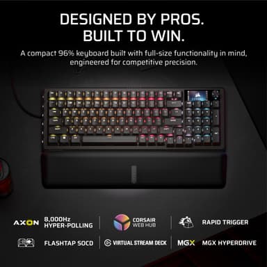 Corsair Vanguard Pro 96 -näppäimistö on monipuolinen ja tehokas vaihtoehto, jossa on MGX Hyperdrive Hall Effect -kytkimet, USB-C-liitettävyys, mukautettava LCD-näyttö, 8K-kyselytaajuus, Rapid Trigger -tekniikka ja näppäinkohtainen RGB-valaistus.Tutustu ominaisuuksiin