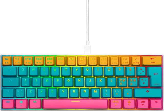 NOS C-450 Mini PRO RGB -pelinäppäimistö erityisillä näppäinhatuilla, 62 näppäimen koolla, RGB-valoilla ja valotehosteilla sekä irrotettavalla USB-C – USB 3.0 -kaapelilla säästää tilaa pöydältäsi uhraamatta toimintoja.Tavallista näppäimistöä pienempi laite sisältää 62 näppäintä pohjoismaisella näppäinasetelmalla sekä tilaa säästävällä rungolla. Minikokoinen mekaaninen näppäimistö on PC- ja Mac-hybridi ja sisältää asetelmia ja toimintoja molemmille käyttöjärjestelmille.