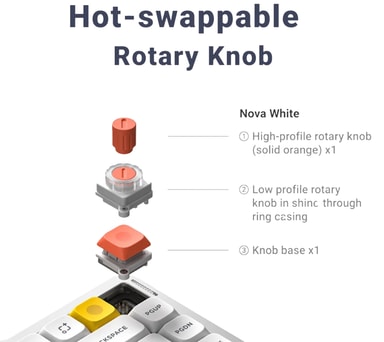 Air75 V3 -näppäimistössä on ergonomisesti matalaprofiiliset, kaksinkertaiset PBT-näppäimet kestävyyden ja käyttömukavuuden takaamiseksi. Merkittävä lisä on pikavaihdettava kiertonuppi, jossa on kaksi korkeusvaihtoehtoa äänenvoimakkuuden tai makrojen tuntosäätöön.