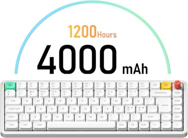 Näppäimistössä on massiivinen 4 000 mAh:n akku, joka tarjoaa jopa 1 200 käyttötuntia valojen ollessa sammutettuina. Täydellä RGB-valaistuksellakin se kestää 60–100 tuntia. Tämä alan johtava kestävyys takaa viikkojen langattoman tuottavuuden yhdellä latauksella ja päihittää useimmat erittäin ohuet näppäimistöt.