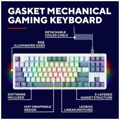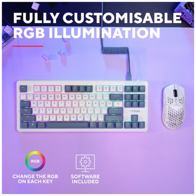 Trust GXT872 Xyra -pelinäppäimistössä on Gasket-kiinnitetty TKL-rakenne, vaihdettavat mekaaniset LEOBOG Seiya -lineaarikytkimet, mukautettava RGB-valaistus ja erilliset Fn-näppäimet.Tutustu ominaisuuksiin