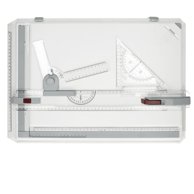 Toimituksen laajuus:1 x piirtopöytä (piirtopää, viivoittimet ja muut tarvikkeet).Tekniset tiedot:Materiaali: muoviKoko: A3Paino: noin 1,3 kgKoko: noin 51,5 x 50,5 x 37 cm.Tukeva levyrunko on valmistettu iskunkestävästä muovista.Helppokäyttö