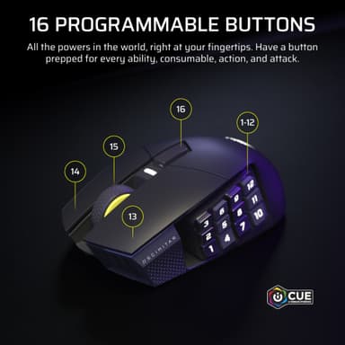 Langaton Corsair Scimitar Elite -pelihiiri sisältää 12 painikkeen sivupaneelin, säädettävän DPI jopa 32 000 asti, kolme yhteystilaa, 16 ohjelmoitavaa painiketta ja Marksman S -sensorin tarkkaan ja täsmälliseen kursorin liikuttamiseen.Tutustu ominaisuuksiin